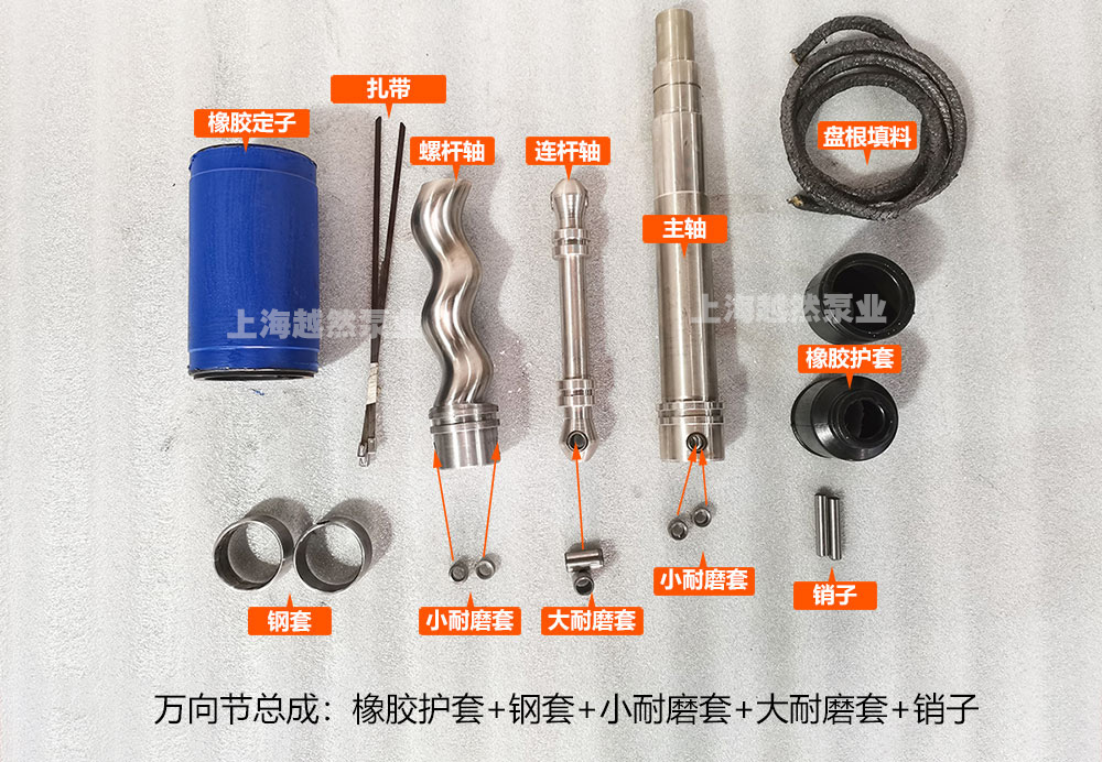 g型單螺桿泵易損件有:定子、螺桿軸、連桿軸、主軸、橡膠護(hù)套、盤根填料等,其中萬向節(jié)總成包括:橡膠護(hù)套、鋼套、大小耐磨套、銷子組成。